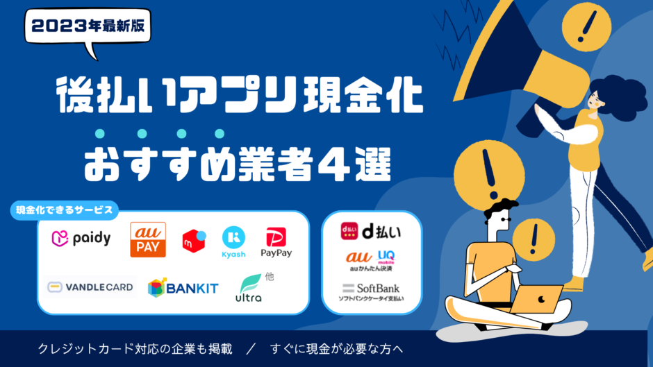 以下に当サイトで紹介する業者で現金化することができる後払いサービスを列挙します。あと払いアプリ以外にも、キャリア決済や、メルペイなども現金化できるので、ランキングで詳しく確認してみてください!
